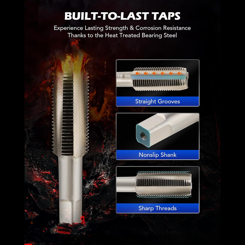 HOCHGESCHWINDIGKEITSSTAHL-GEWINDEBOHRER – Die aus HSS4241-Schnellarbeitsstahl gefertigten Gewindebohrer sind außergewöhnlich hart und verschleißfest. Dies ermöglicht ein sauberes, präzises Nachfädeln des Abflusslochs und sorgt so für eine langlebige und zuverlässige Reparatur.