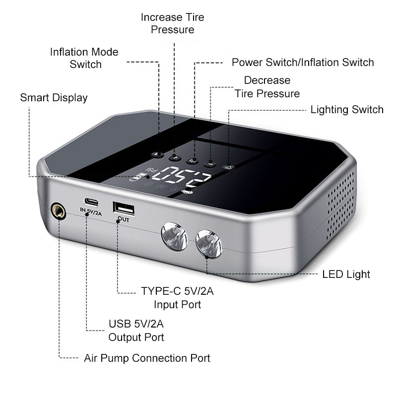 Starthilfe-Powerbank mit integriertem Kompressor für Autos