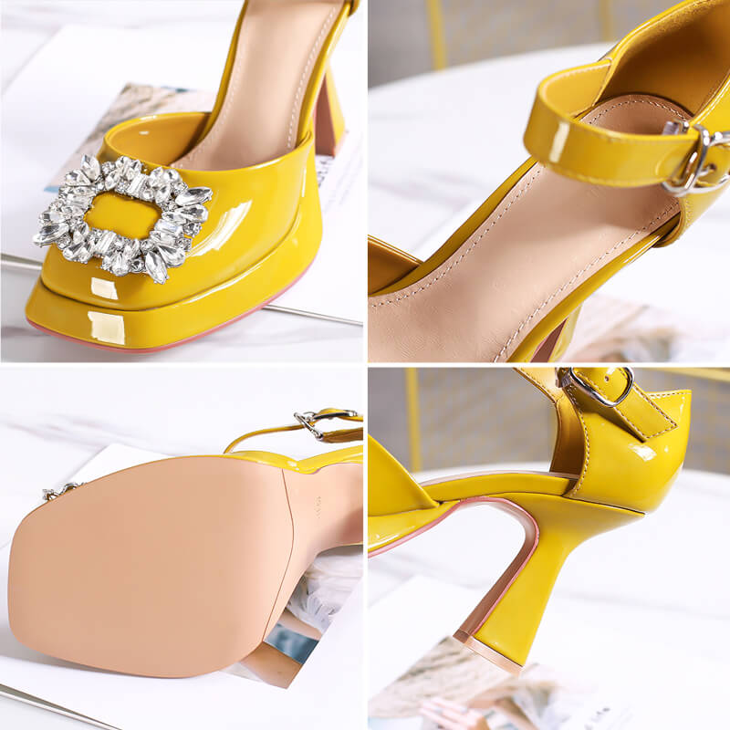 Diese kleinen, quadratischen Zehensandalen mit französischem Strassabsatz sind perfekt für jede Gelegenheit. Mit einem schlanken und stilvollen Design, sind diese Sandalen sicher, Köpfe zu drehen. Mit einer spitzen Zehe und einem stabilen hohen Absatz, bieten diese Sandalen sowohl Komfort als auch Stil.