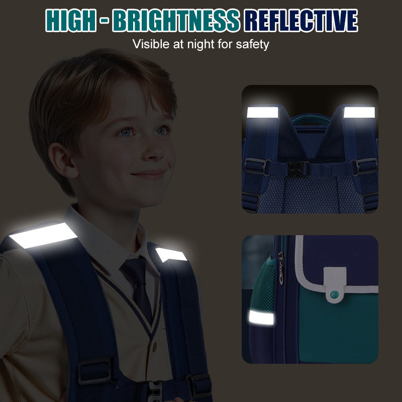 HOCHREFLEKTIERENDE REFLEKTORSTREIFEN: Für die Sicherheit bei Nacht ist der Rucksack an mehreren Stellen mit hochreflektierenden Streifen ausgestattet. Diese reflektierenden Materialien können das Licht von Autoscheinwerfern und Straßenlaternen reflektieren und haben eine Warnreichweite von bis zu 300 Metern. Dadurch sind Kinder nachts für Fahrzeuge gut sichtbar, was ihre Sicherheit erheblich verbessert.