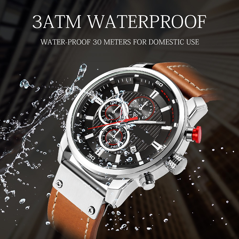 ANSPRUCHSVOLLES DESIGN – Diese Uhr verfügt über ein rundes Zifferblatt mit drei Hilfszifferblättern, die die Funktionalität der Uhr für eine präzise Zeitmessung verbessern. Das Hauptzifferblatt enthält klare Stunden-, Minuten- und Sekundenzeiger sowie ein Datumsfenster für zusätzlichen Komfort. Die metallische Lünette und das polierte Gehäusedesign sorgen für eine elegante, moderne Ästhetik, die sich sowohl für den Freizeit- als auch für den Berufsalltag eignet.