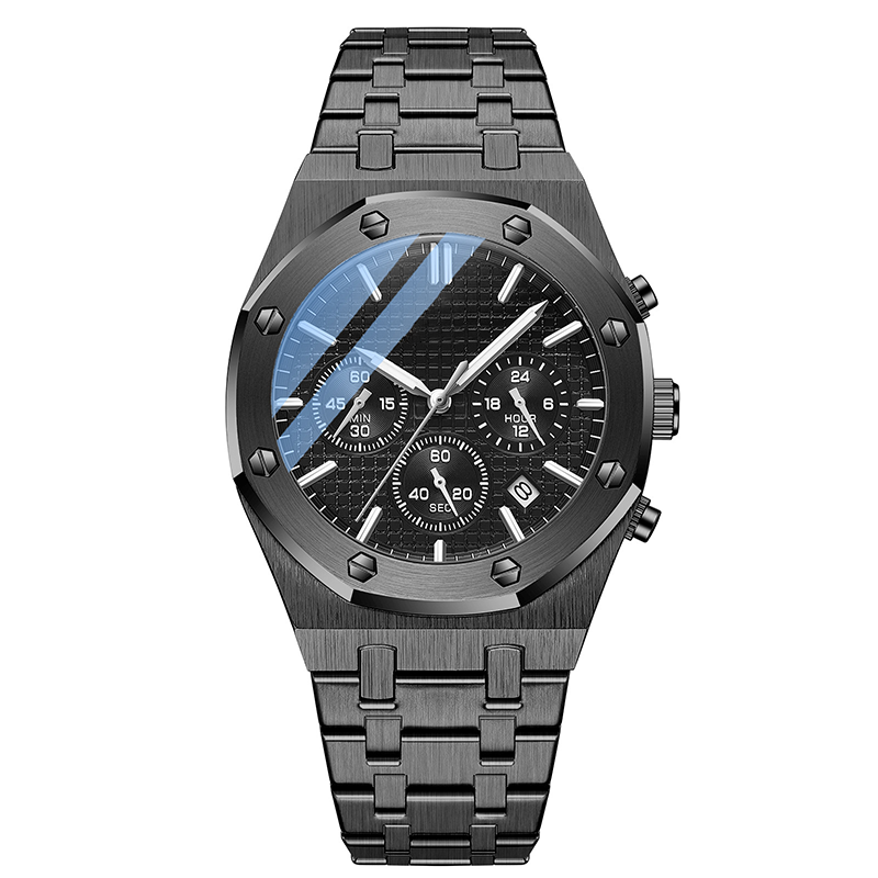 MULTIFUNKTIONALES ZIFFERBLATT MIT VERBESSERTER LESBARKEIT: Ein großes Hauptzifferblatt mit drei Hilfszifferblättern zeigt Stunden, Minuten und Sekunden an und verfügt über eine Chronographen- und Kalenderfunktion. Das übersichtliche Layout gewährleistet eine schnelle und genaue Zeitmessung für den Alltag oder einen aktiven Lebensstil.