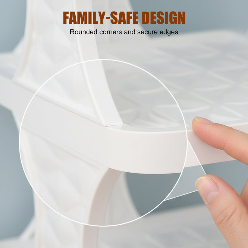 SICHERHEITSBEWUSSTES DESIGN – Mit glatten, abgerundeten Ecken, um versehentliche Stöße zu verhindern, und erhöhten Kanten an jedem Regal, um die Schuhe sicher an ihrem Platz zu halten, ist dieses Regal auf die Sicherheit im Haushalt ausgelegt.