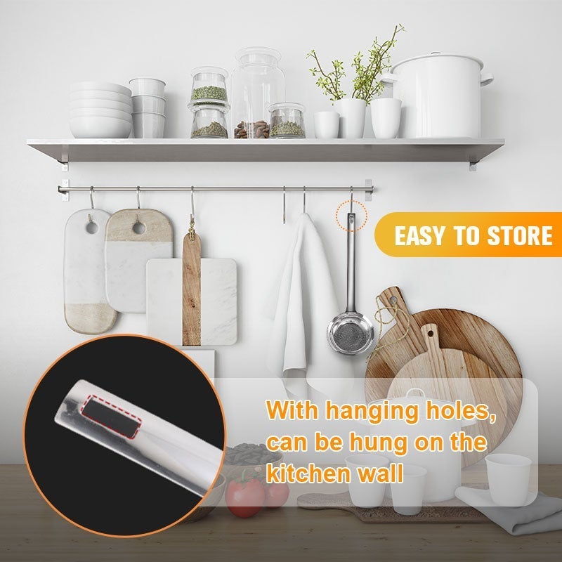 - Das Ende des Griffs ist mit einem Aufhängeloch versehen , sodass er an der Küchenwand aufgehängt werden kann, was die Organisation erleichtert und keinen zusätzlichen Platz einnimmt.