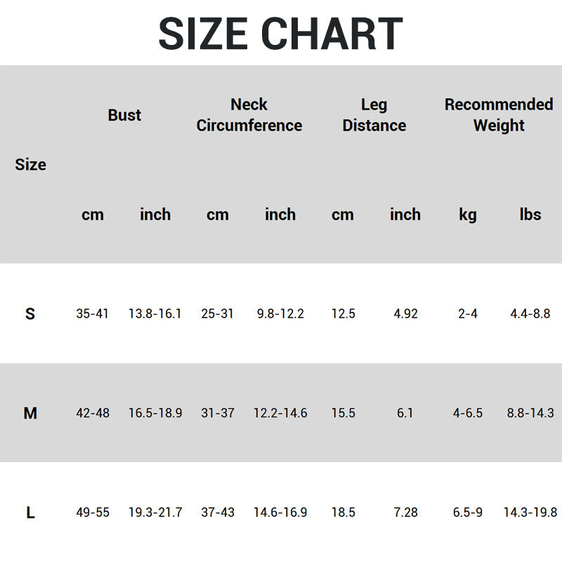 GröĂe | Brustumfang | Halsumfang | Beinabstand | Empfohlenes Gewicht |